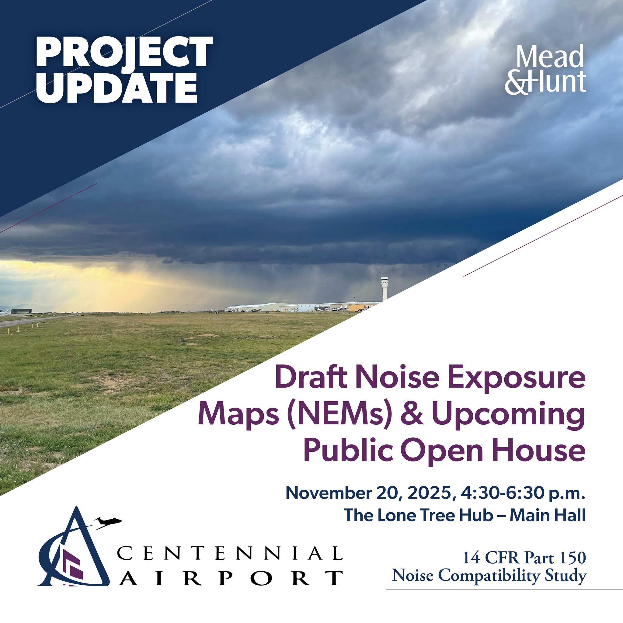 Centennial Airport will hold its third Part 150 Study public open house on Thursday, November 20, 2025, from 4:30 to 6:30 p.m., with a brief presentation at 5:00 p.m., in the Main Hall at The Lone Tree Hub. The purpose of the meeting is to share and collect feedback on the NEM package before its submittal to the FAA for acceptance.