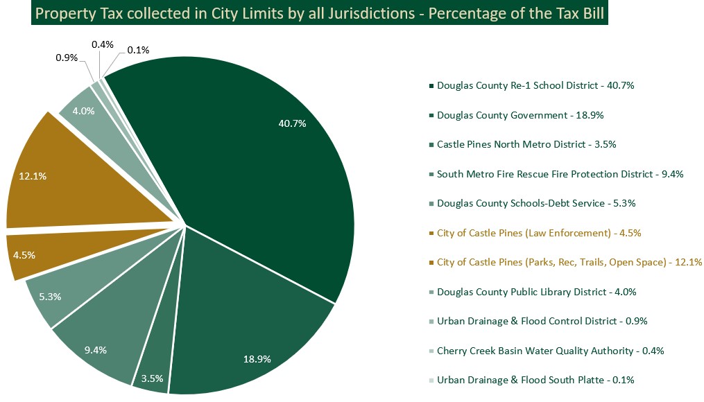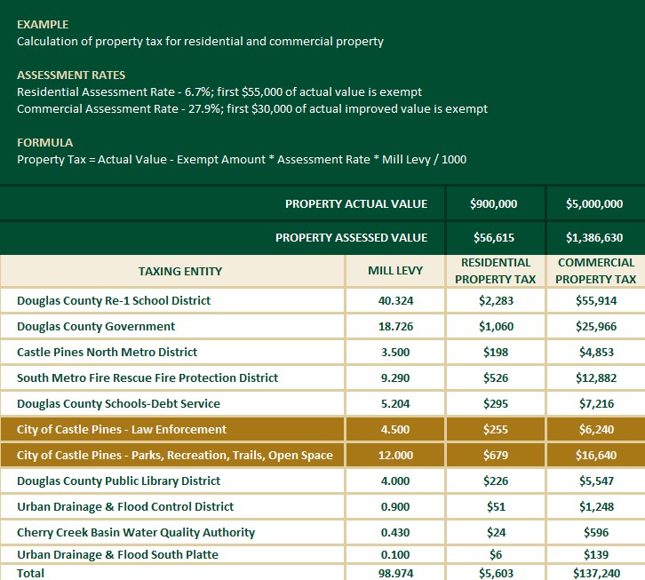 Below is a breakdown of the property taxing entities in Castle Pines using a $900,000 home and $5,000,000 commercial property as examples. The following example is for a property owner who lives within the original boundary of the Castle Pines North Metropolitan District. Rates can differ for residents across the city, depending on which metropolitan district boundary you live in. Residential properties are currently assessed at a rate of 6.7%, while commercial properties are assessed at a rate of 27.9%.